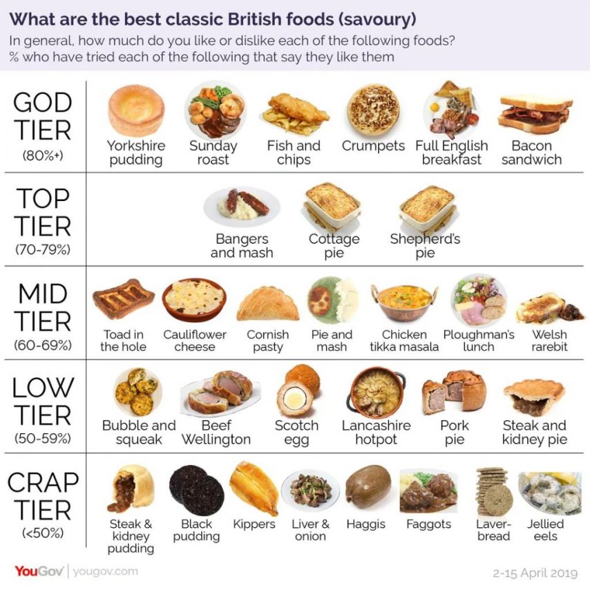 최고의 영국 음식(일반 음식, 간식) 티어표라네요.