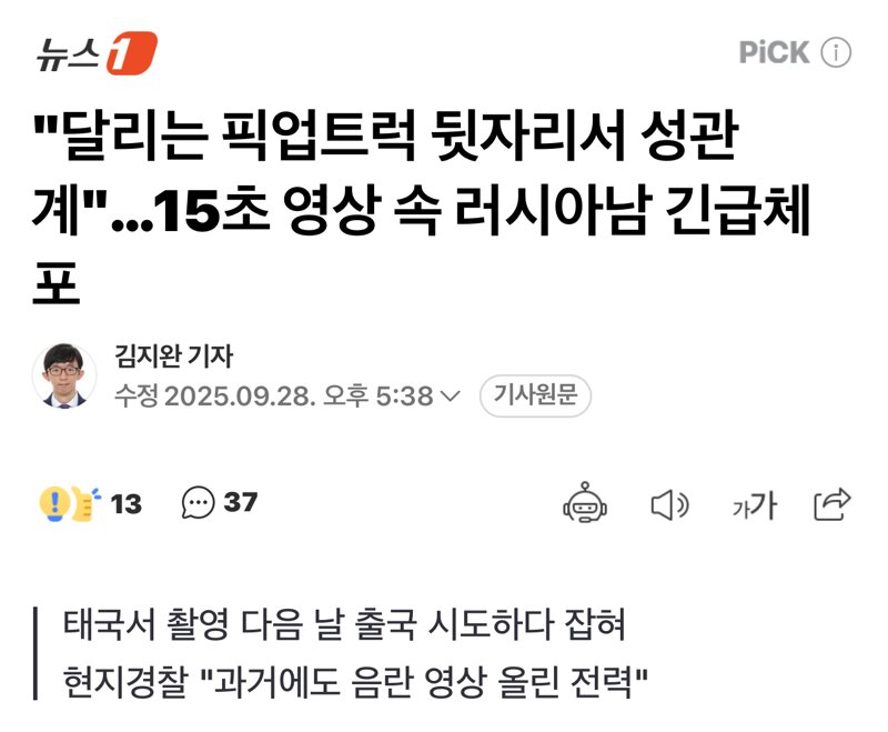 달리는 픽업트럭에서 태국 여성과 성관계를 맺은 러시아인 체포