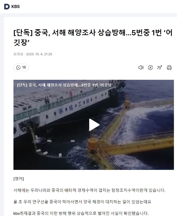 우리나라의 한국해양과학기술원 조사선을 짱깨 해경이 막아서는 등 어깃장을 놓는 경우가 많은가봅니다.