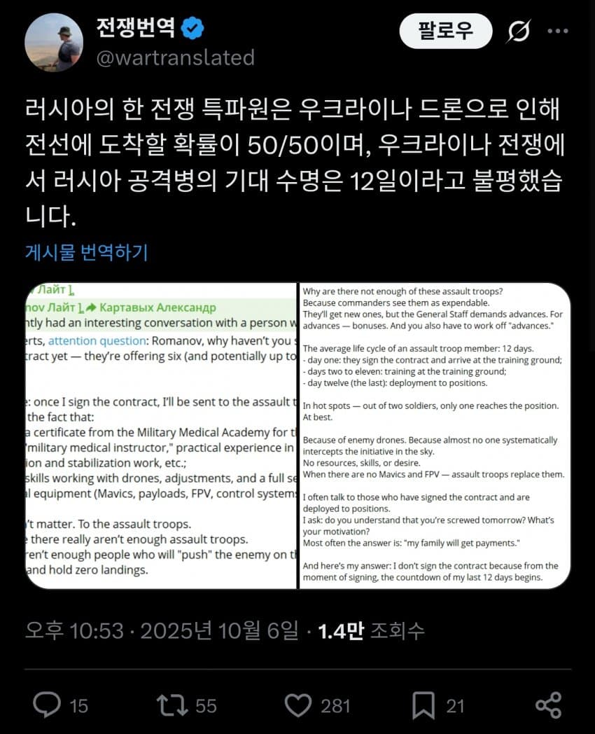 러시아 공격병의 기대수명은 12일