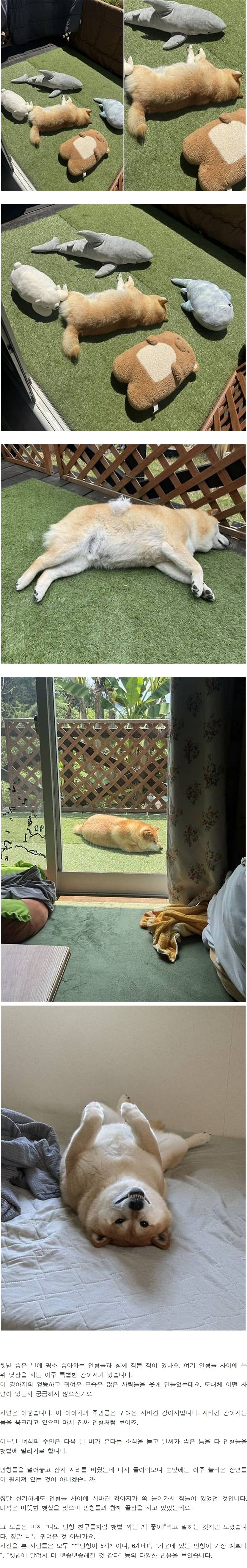 인형들 사이 인형인 척 자연스럽게 낮잠 자는 '진짜' 강아지.