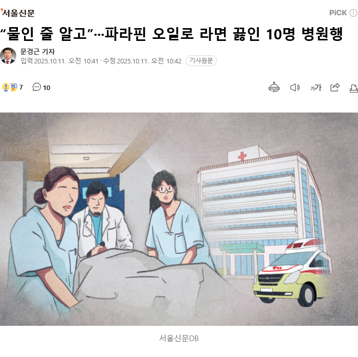 “물인 줄 알고”···파라핀 오일로 라면 끓인 10명 병원행