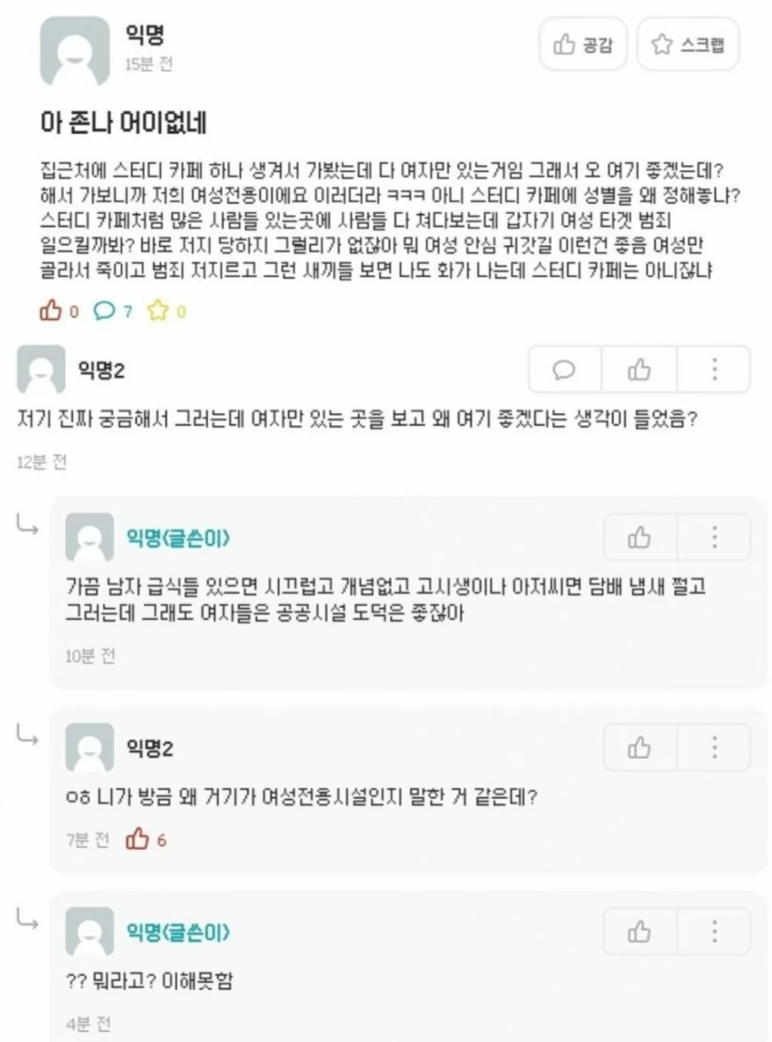스터디 카페에 왜 성별 정해 놓냐? 어이 없네