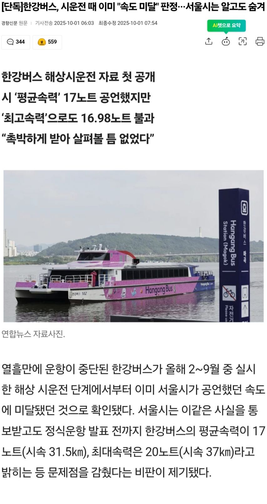한강버스, 시운전 때 이미 "속도 미달" 판정···서울시는 알고도 숨겨