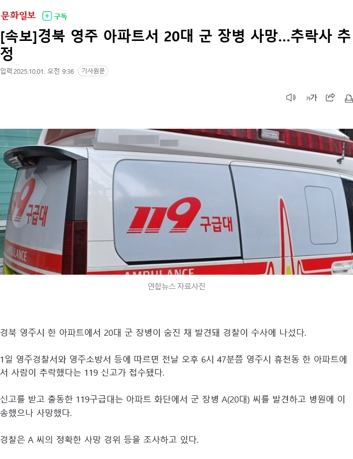 [속보]경북 영주 아파트서 20대 군 장병 사망…추락사 추정