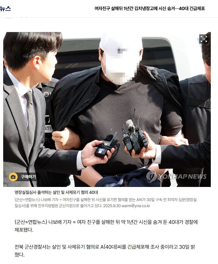 여자친구 살해뒤 1년간 김치냉장고에 시신 숨겨…40대 긴급체포 | 연합뉴스 여자친구를 살해 후 1년동안이나 김치 냉장고에 보관을 하다가 잡혔네요