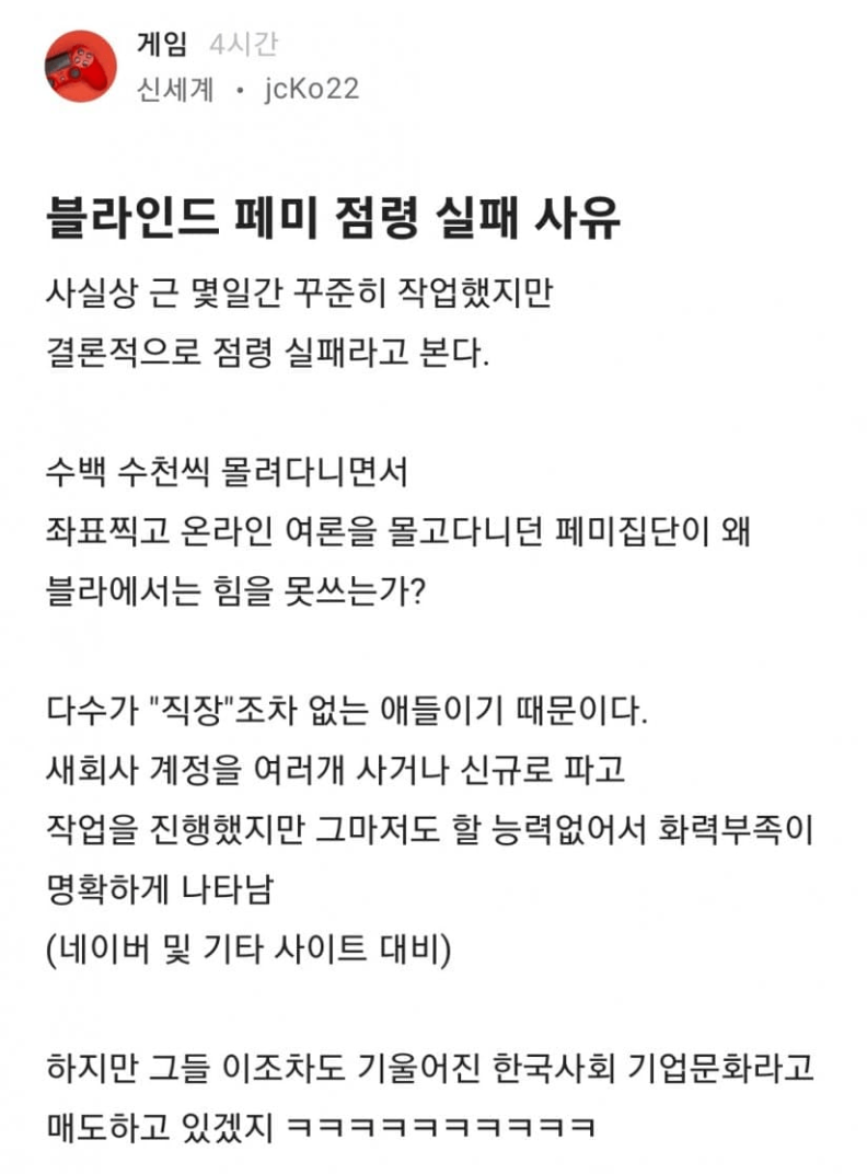 페미가 블라에서 힘을 못 쓰는 이유ㅋㅋ
