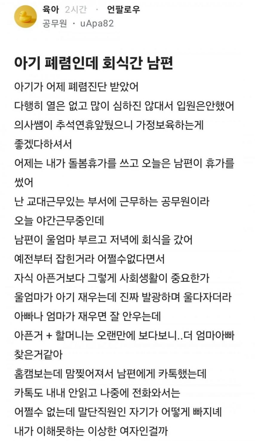 덧글에서 그려질 상황이 '애가 아프다잖아요. 어제는 엄마가 돌봄 휴가 써서 봤다잖아요.'