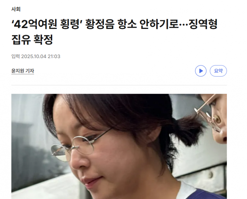 회삿돈 42억여원을 뻬돌려 1심에서 횡령 혐의로 재판에 넘겨진 가수 출신 배우 황정음에게 징역형 집행유예가 확정됐다.