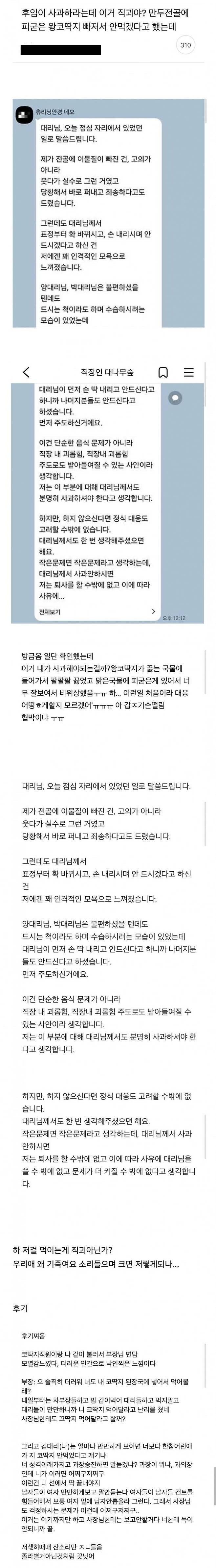 자기 코딱지 빠진 음식 안먹는다고 크레임건 여성 사원