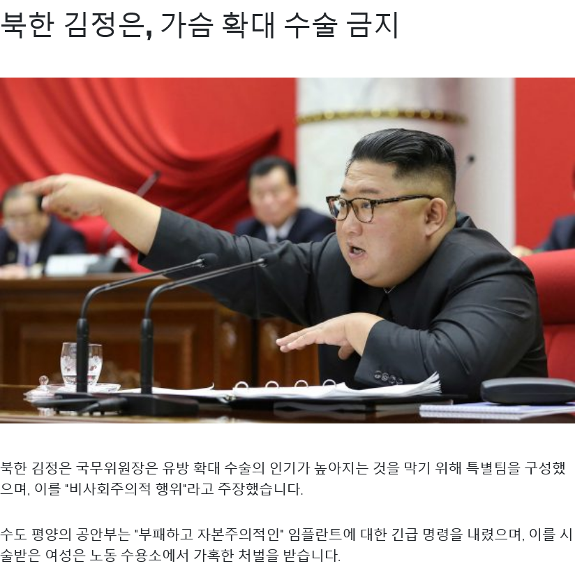 김정은, 가슴확대수술 금지 지시 - 썩어빠진 자본주의 산물이자 반사회주의적 행위