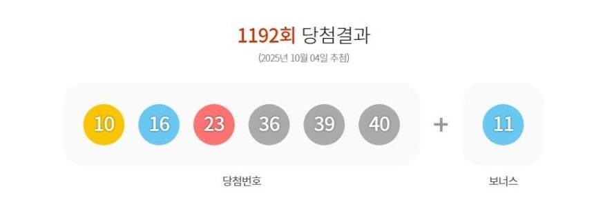 5일 동행복권에 따르면 전날 추첨한 제1192회 로또복권의 1등 당첨번호는 10·16·23·36·39·40이다.