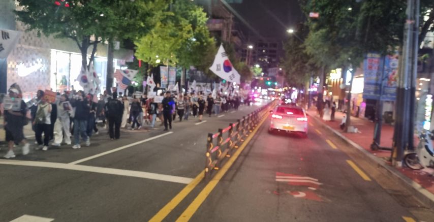 지난주 토요일 저녁 7시30분 홍대 로데오거리 차도에서 부정선거 무효를 외치면서 행진하던 벙신병자들.