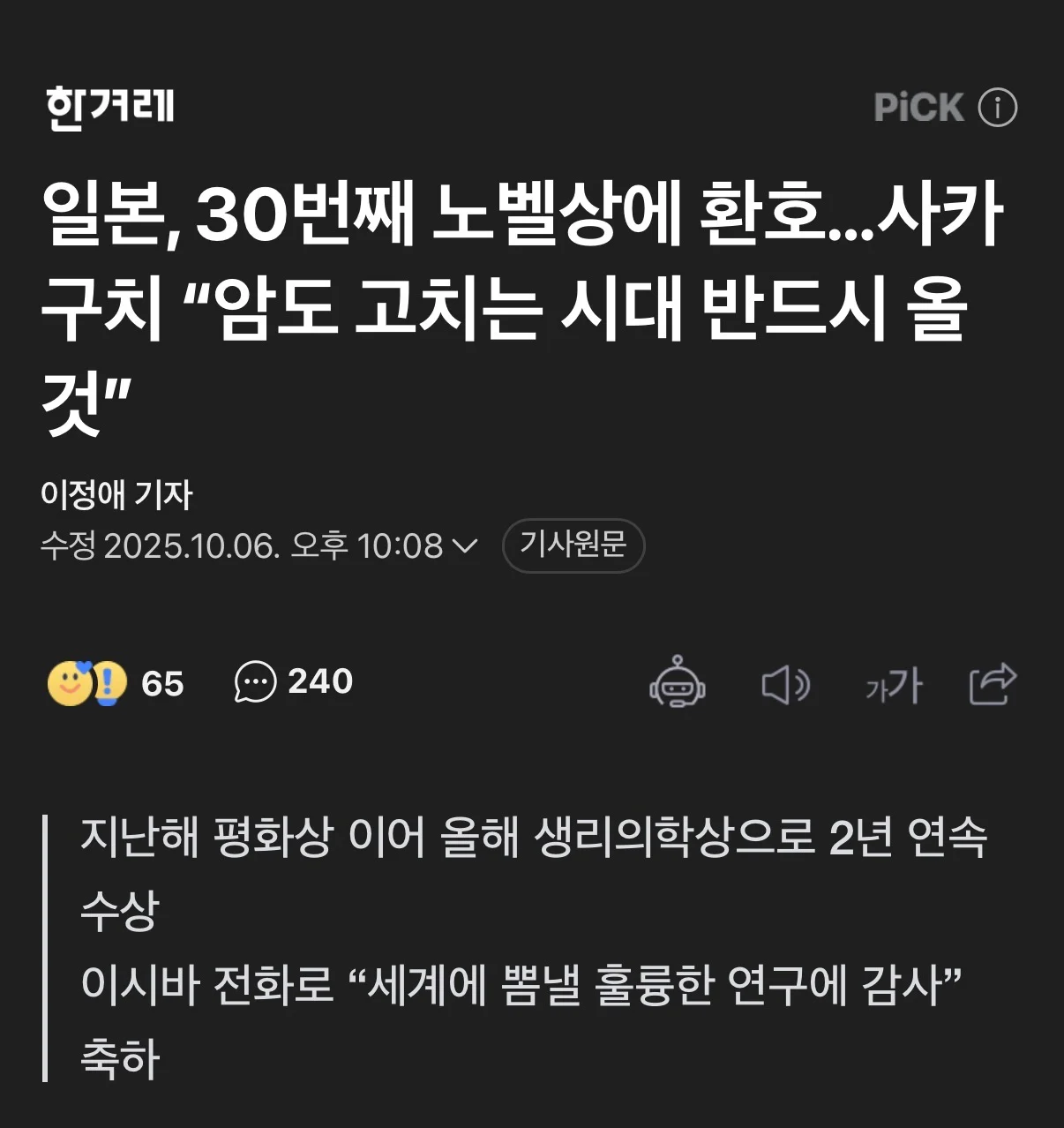 일본 노벨상 수상자 “암도 반드시 정복 할 것.“