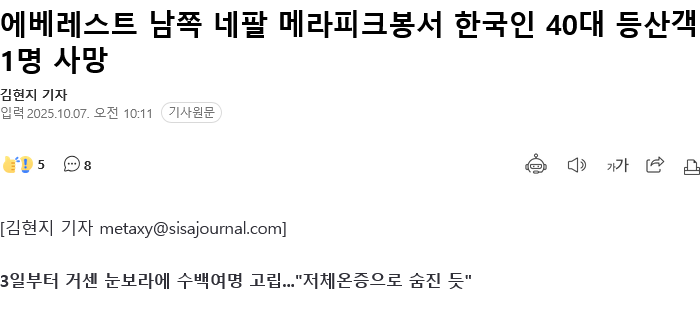 로이터 통신 등 외신은 6일(현지시간) 네팔과 중국 국경지대에 있는 에베레스트 산(해발 고도 8850m) 남쪽에 위치한 네팔 동부 메라피크봉(6476m) 일대에서 46세 한국인 등산객의 시신을 구조헬기가 수습했다고 보도했다. 그와 함께 산을 오른 셰르파(등반 안내인)는 해발 약 5800m 지점에서 극적으로 구조됐다.