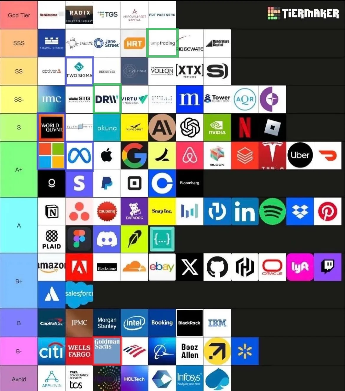 God tier에 분류되는 회사들은 모두 주식투자 자동매매 회사들로, 인턴이 월급 4000만원부터 시작한다고 함 ㄷㄷ