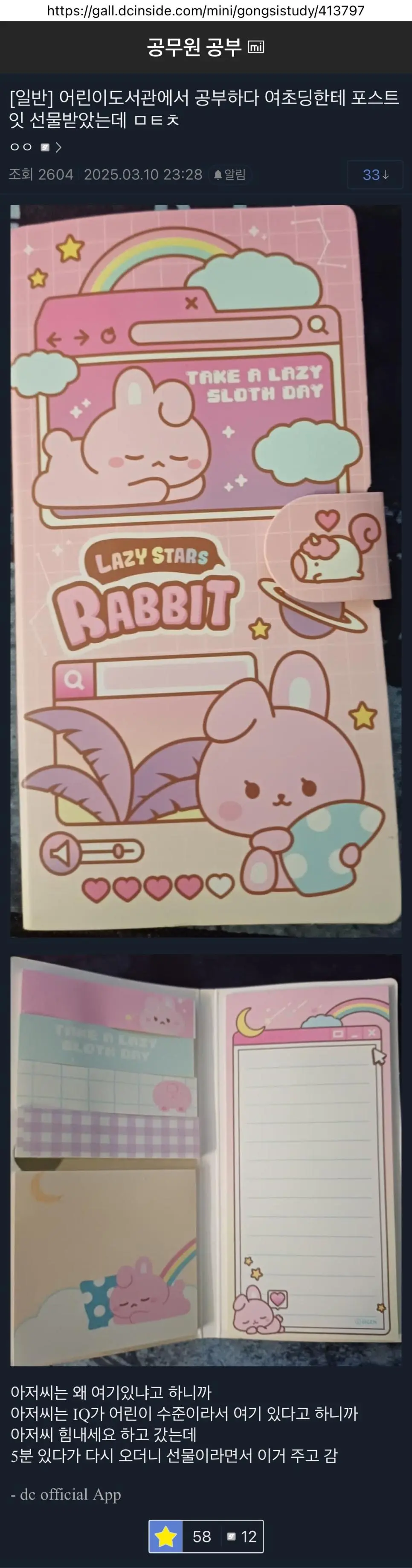 도서관에서 여초딩한테 쪽지 받은 디시인