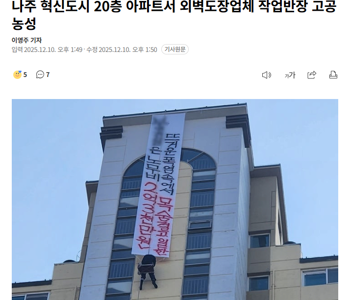 [사회] 나주 혁신도시 20층 아파트에서 작업반장 고공 농성중 [댓글수 1]