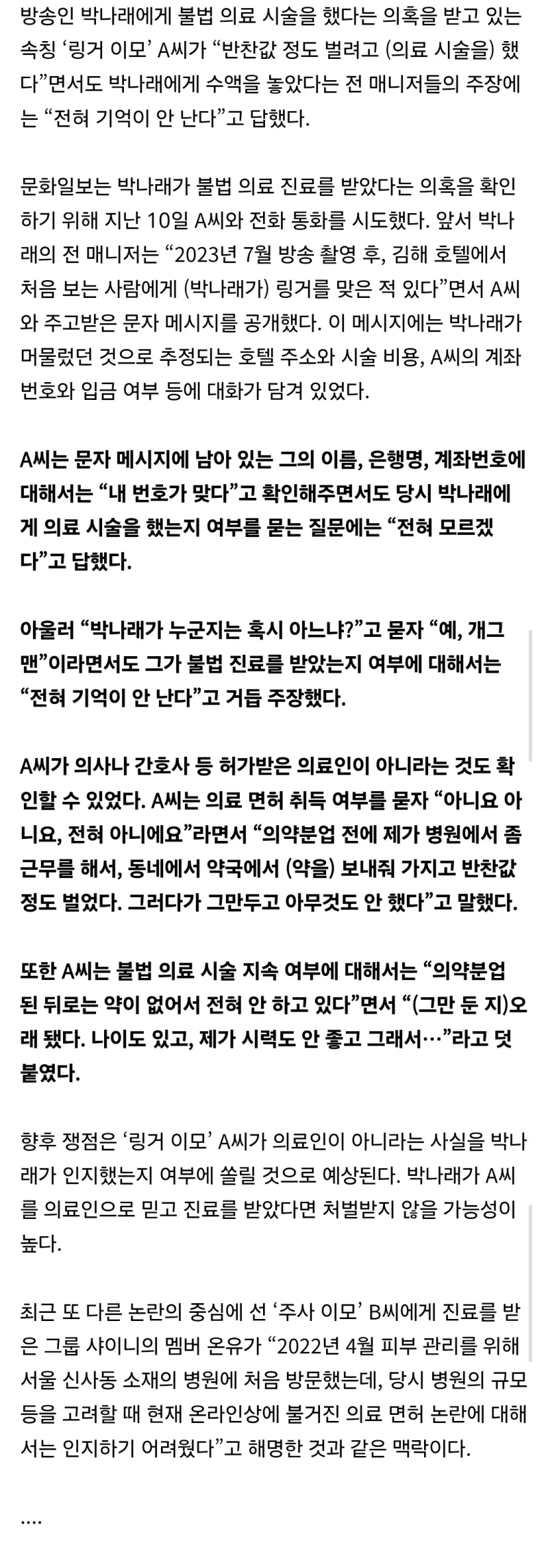 [유머] 링거이모 입장발표: "박나래 시술 해줬는지 기억이 안나" [댓글수 1]