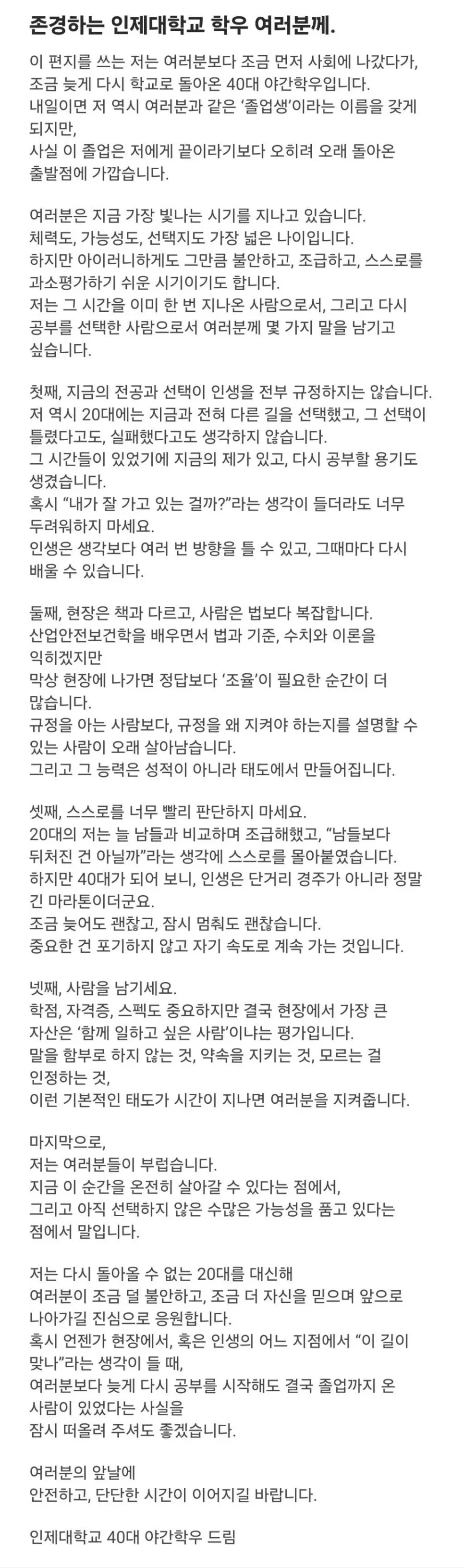 [유머] 40대 야간대생이 20대에게 쓰는 편지 [댓글수 2]