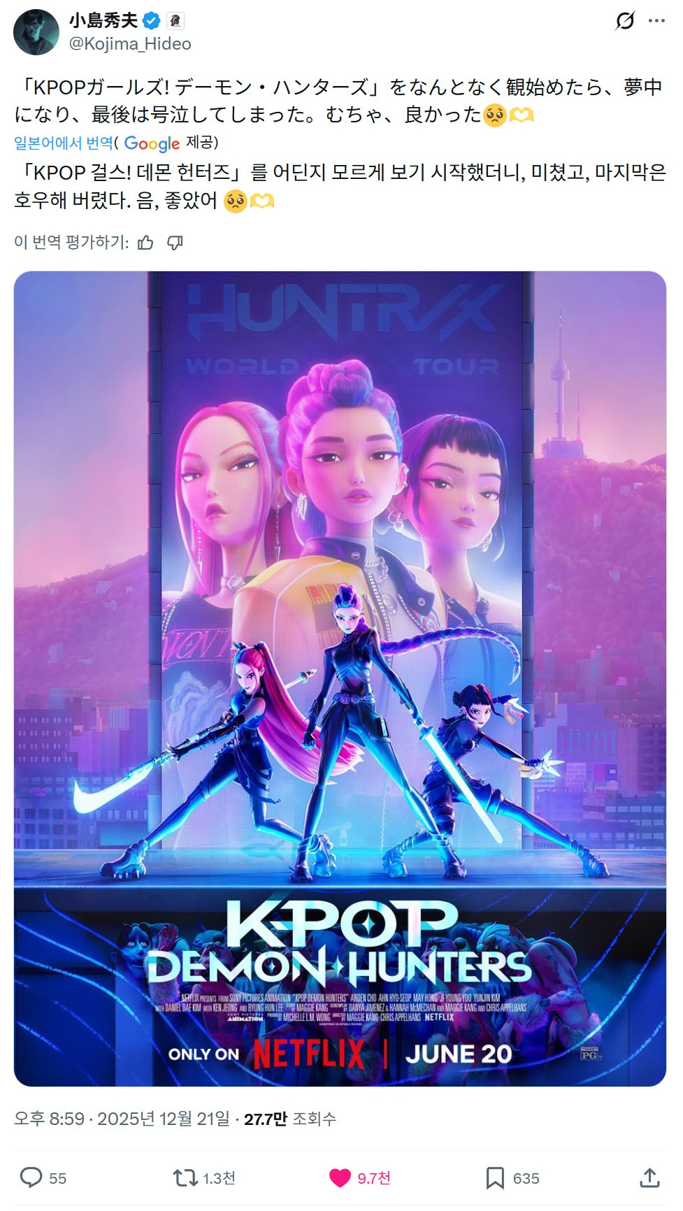 메탈기어등의 대작 게임으로 유명한 코지마 히데오가 어제 트윗에 케데헌에 대한 감상을 남겼습니다.