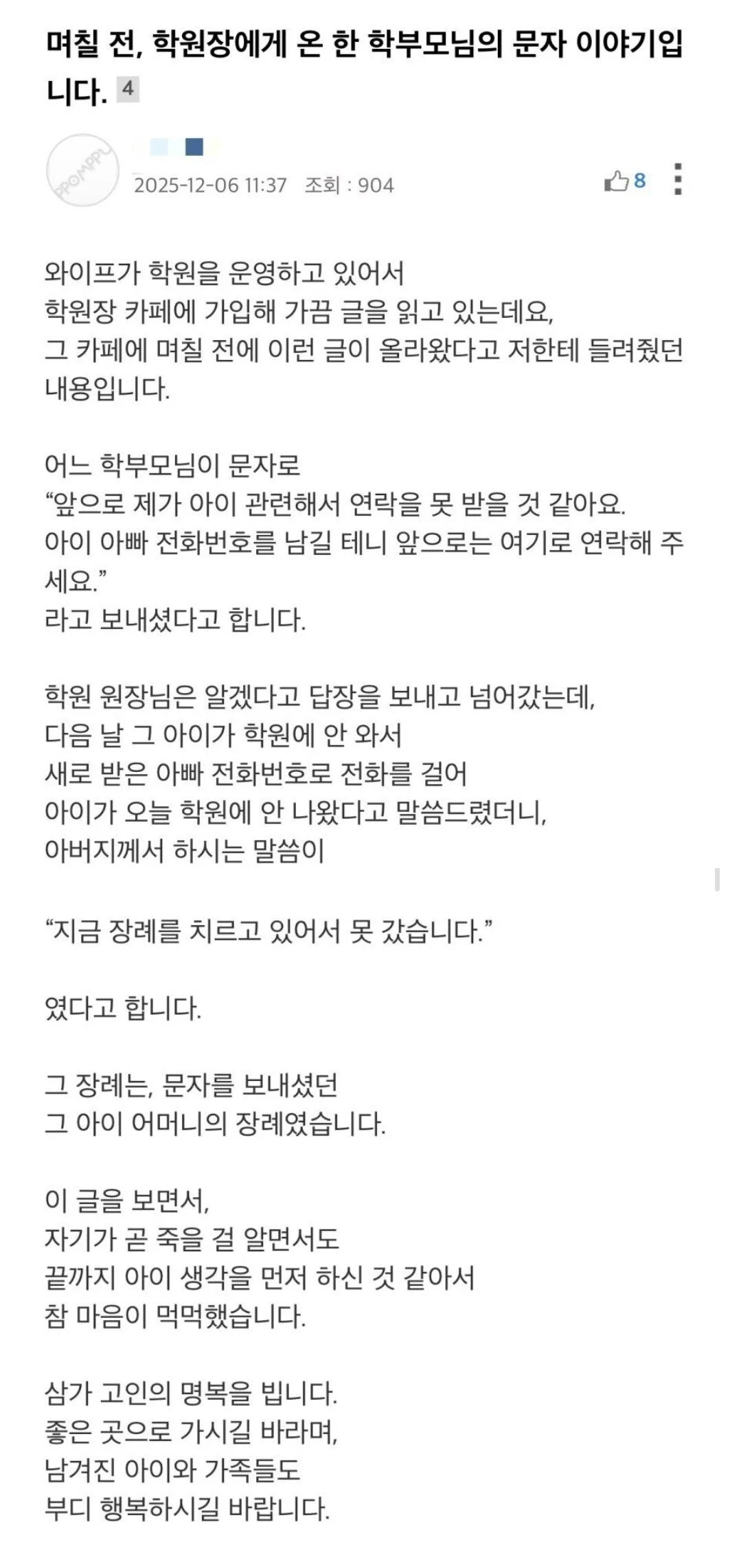 [감동] 앞으로는 남편한테 연락해달라는 학부모의 문자를 받은 학원 원장 [댓글수 1]