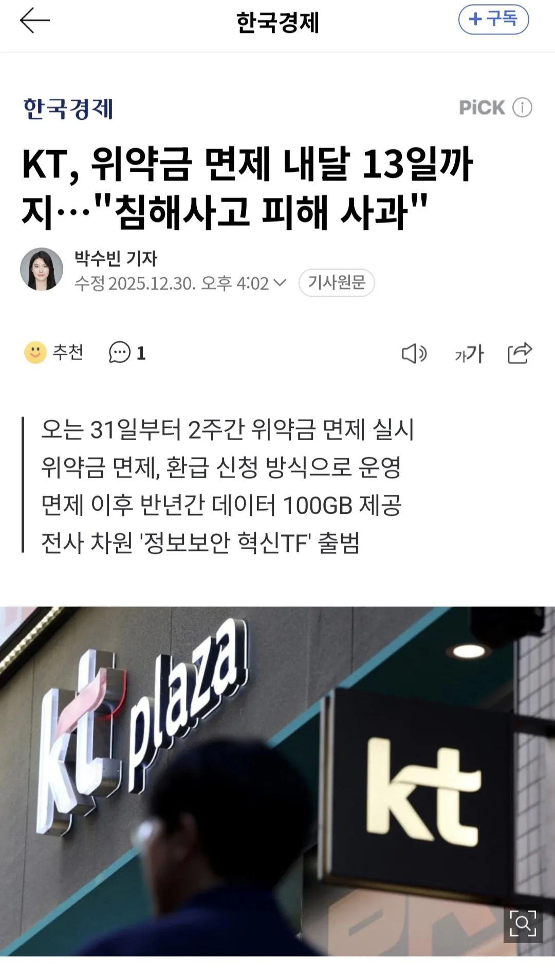 [사회] KT 개인정보 유출로 전고객 위약금 면제 [댓글수 1]