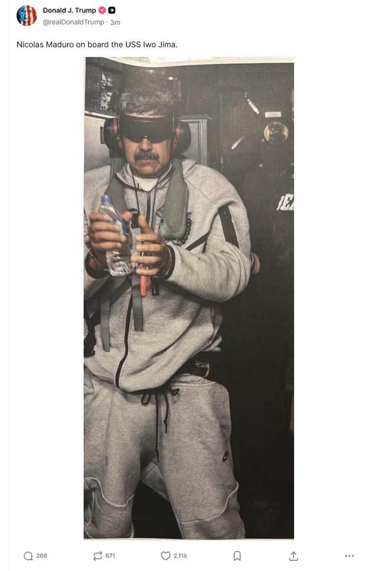 그동안 마두로 체포 관련 AI 조작 사진이 많이 돌아다녔는데 트럼프가 본인 계정으로 직접 사진을 공개했습니다.