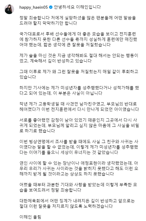 이로서 이해인은 강화훈련 기간 중 음주 소란 행위에 따른 자격정지 3개월 이하의 처분만 받는 것으로 마무리 됨