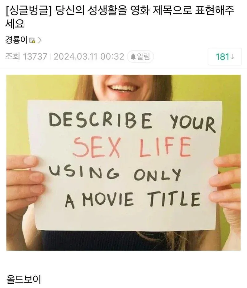 [유머] 당신의 성생활을 영화제목으로 말해주세요 [댓글수 1]