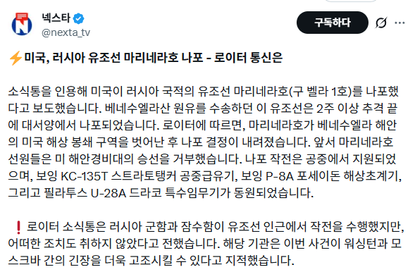 다른 나라에 등록된 선박도 아닌 아예 러시아 국적 달고 있는 선박에 미군이 투입되서 나포... 제재 대상이니 나포는 당연한데 러시아는 발작할지도..