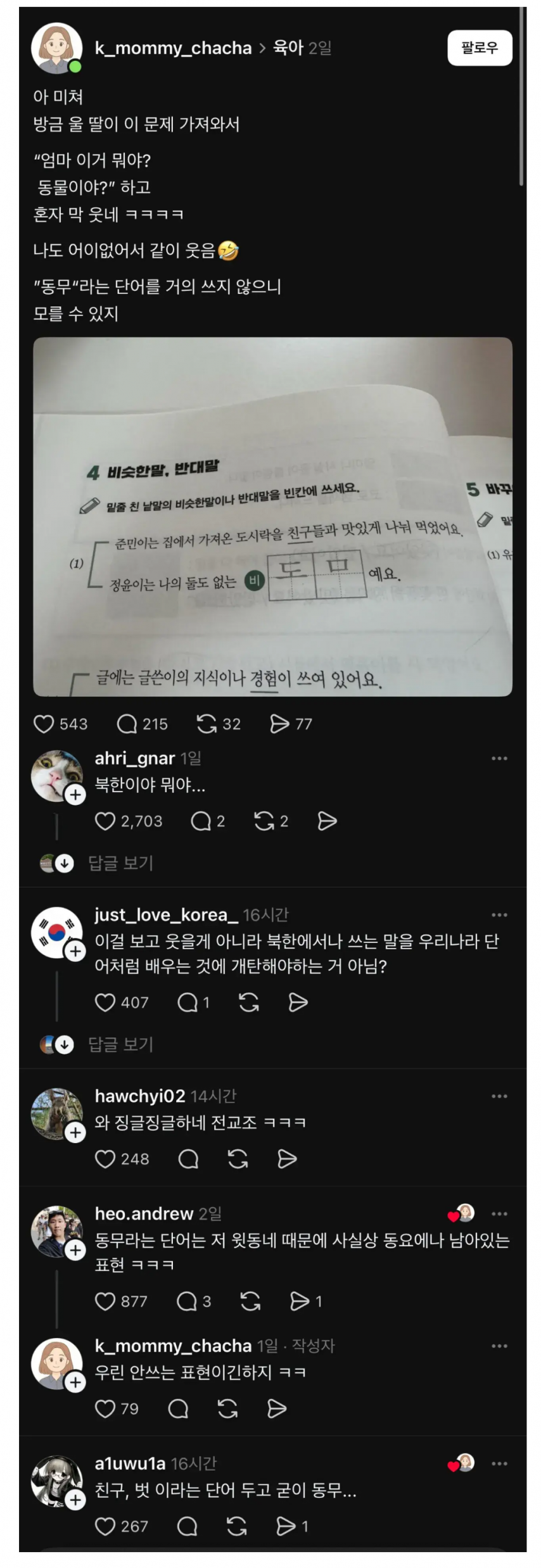 [유머] 요즘 초등 국어 문제 근황… 정답이 ‘동무’임 [댓글수 1]