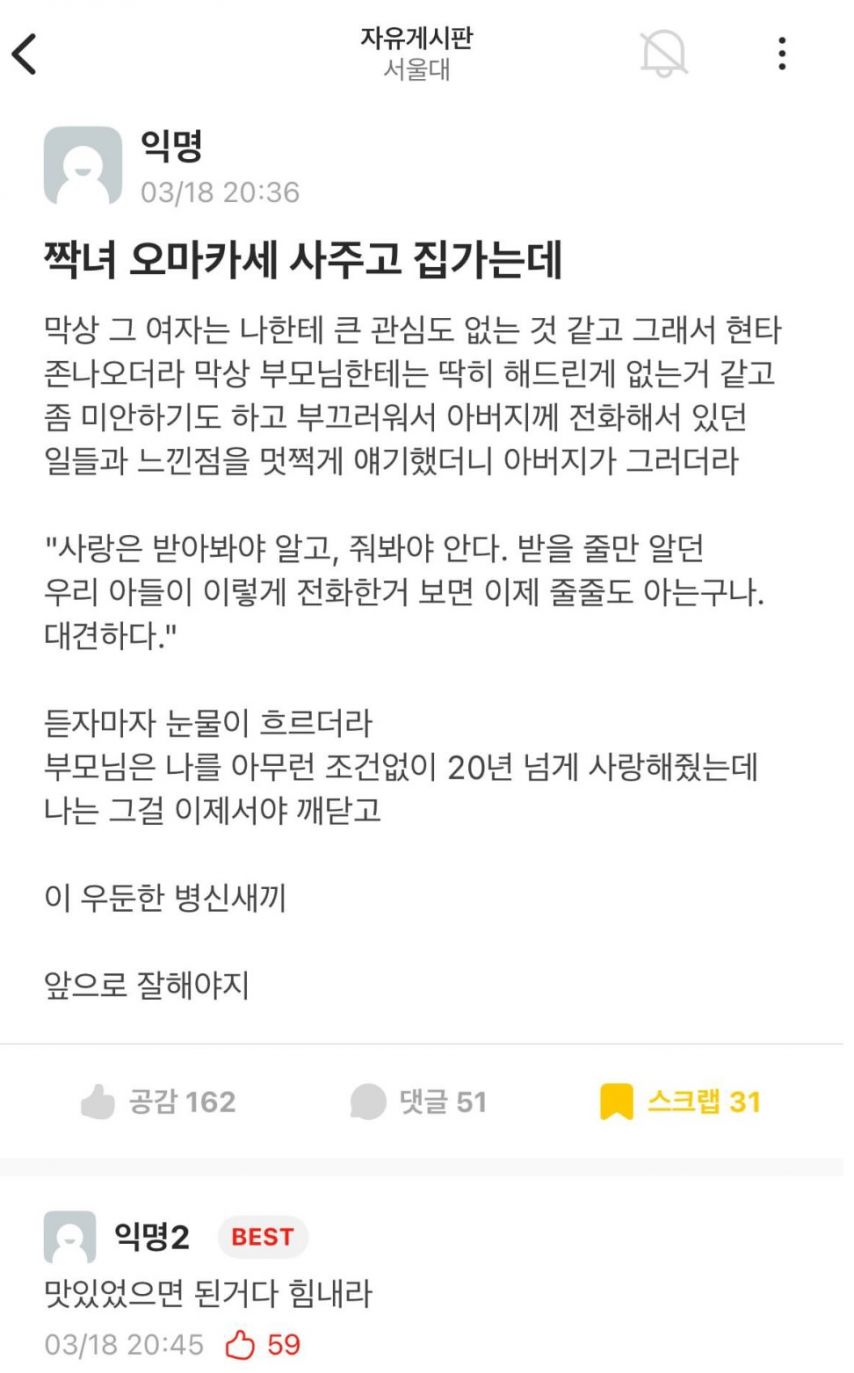 [기타] 짝녀 오마카세 사주고 집 가다가 아버지께 전화했다는 서울대생 [댓글수 1]