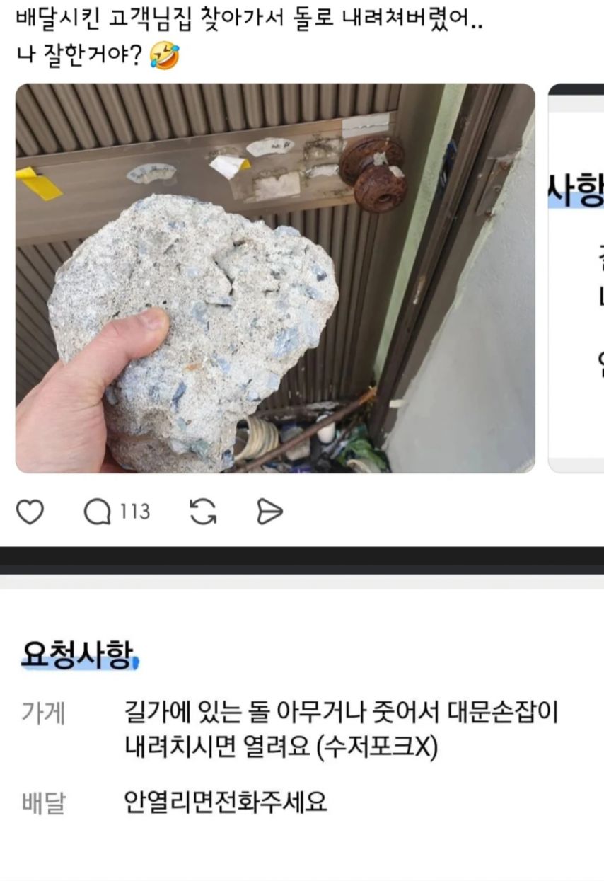 [유머] 배달시킨 집 대문손잡이 돌로 내려친 배달기사.jpg [댓글수 2]