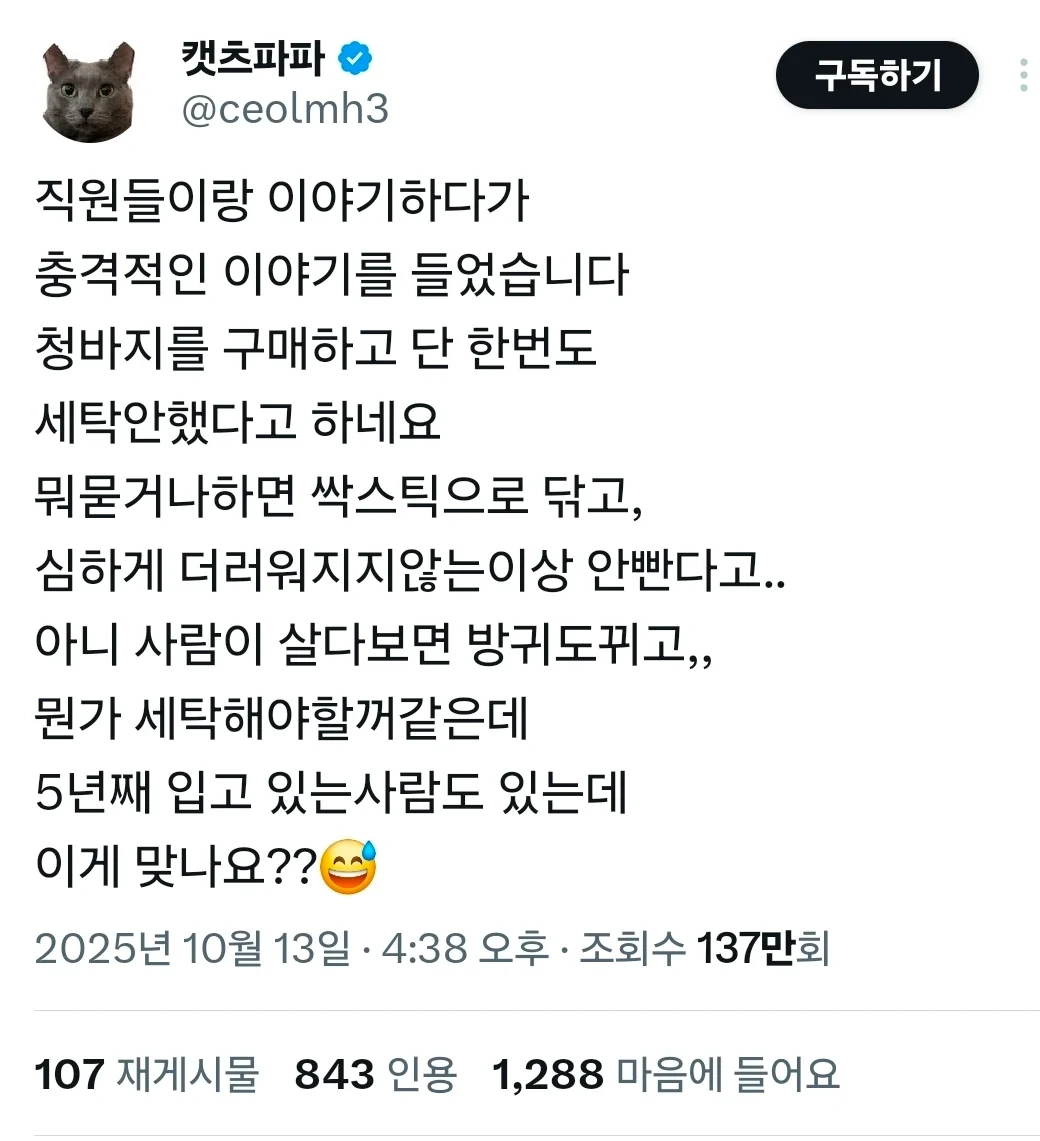 [기타] 청바지를 구매하고 한번도 세탁 안했다고 [댓글수 1]