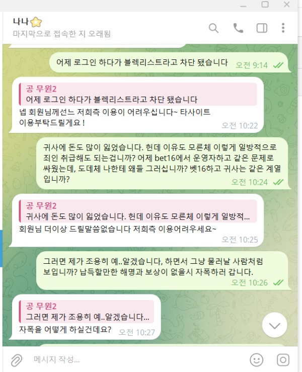 어느날 갑자기 벳16 측에서 저를 차단 했습니다