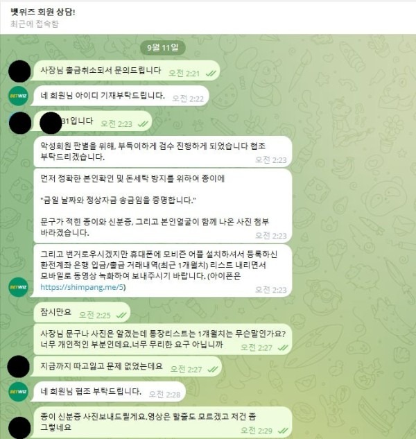 table.type03 { border-collapse: collapse; text-align: left; line-height: 1.5; border-top: 1px solid #ccc; border-left: 3px solid #369; margin : 20px 0; width:90%; } table.type03 th { width: 20%; padding: 10px; font-weight: bold; vertical-align: top; color: #153d73; border-right: 1px solid #ccc; border-bottom: 1px solid #ccc; text-align:right; background:#f4f4f4; } table.type03 td { width: 80%; padding: 10px; vertical-align: top; border-right: 1px solid #ccc; border-bottom: 1px solid #ccc; font-weight:bold; } @media all and (max-width:800px) { table.type03 { border-collapse: collapse; text-align: left; line-height: 1.5; border-top: 1px solid #ccc; border-left: 3px solid #369; margin : 20px 0; width:100%; } table.type03 th { width: 35%; padding: 10px; font-weight: bold; vertical-align: top; color: #153d73; border-right: 1px solid #ccc; border-bottom: 1px solid #ccc; text-align:right; background:#f4f4f4; } table.type03 td { width: 65%; padding: 10px; vertical-align: top; border-right: 1px solid #ccc; border-bottom: 1px solid #ccc; font-weight:bold; } } 사이트명 벳위즈 사이트주소 https://www.bwzkix1.com/ 먹튀날짜 2025년 9월 10일 먹튀금액 5,200,000 온갖 말도 안되는 자료 요구에 민증들고 셀카요구. 수많은 이체확인증 4시간반에 걸쳐 지푸라기라도 잡는심정으러 요구하는거 다 들어주고 협조해주고 했지만 끝도없이 무한으러 말도 안되는 해명자료 무한대로 요구함.. 지인에게 송금한 내역을 문자나 대화 기록인증하라고하고 없으면 녹취파일 보내라고하고 돈세탁의심 및 양방이라는 헛소리 시전........ 결국 4시간반동안 끌려다니다 포기하고 각종 커뮤니티에 알리기로 했습니다 여러분 절대 쓰면안됩니다 구멍가게입니다