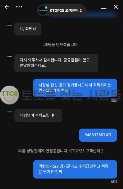 멀쩡한 베팅 내역을 레이트 베팅이라며 뒤늦게 후적 처리한 후 모르쇠로 일관 중인 먹튀사이트 케이탑25 모든 내용을 제보합니다. 실시간 베팅에 찍었었고 늦지 않게 정확한 시간에 들어갔구요. 이미 언더는 확실시된 상황이었고 돈 먹어서 바로 출금할 생각이었는데 변수가 발생할 줄은 저도 몰랐습니다.
