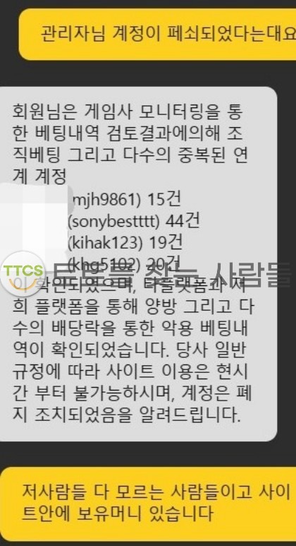 한 1주일 정도 이용했을까요? 초기에 몇 번 나오던 환전은 이제 불통이 되었네요. 그래도 고객센터가 대답은 해주길래 혹시나 하는 기대감을 갖고서 문의했습니다. 저에게 조직 베팅 혐의를 물으며 다른 토토사이트도 이용 못 할거라고 경고까지 하는데 웃음밖에 안 나옵니다. 제가 다른 사람들과 연계해서 양방 쳤다고 뻔뻔하게 나옵니다.