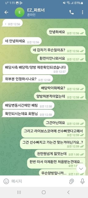 약 한 일주일전부터 사용했구요 다른곳찾다가 다른곳보증도걸려있다길래 사용해봣습니다 500만원씩 충전해서 계속 펏어요 이제까지 한번도 환전받은적도없습니다 하지만 오늘 500만원 충전해서 처음으로 땃어요 그래서 총잔액이 9.996.000 이 되었구요 환전을누르니까 갑자기 텔레로 연락달라고하시더니 텔레로 양방이니 뭐 락배팅이니 말하시길래 저는그런부분 잘몰랏다고 라이브스코어를보고 어디팀에 선수가 빠졋다고 사람들이 배팅해야된다길래 저도 그픽믿고 여러번 들어갔엇어요 그리구 그부분은 진짜몰랐으니 죄송하다고 계속말을헀고 사이트에선 무슨 자기네는 사무실을 안받는다카면서 이상한소리하더라구요 사무실아니라고 말씀드렸고 저는 일반인이라고 왜자꾸 그렇게엮냐고 그러면 그거실수인정할테니 원금이라도 달라고했습니다 몇번에 사과도했구요 근데 원금까지 싹다 먹튀까고 지금 아예들어가지도 못하게만들어놧습니다