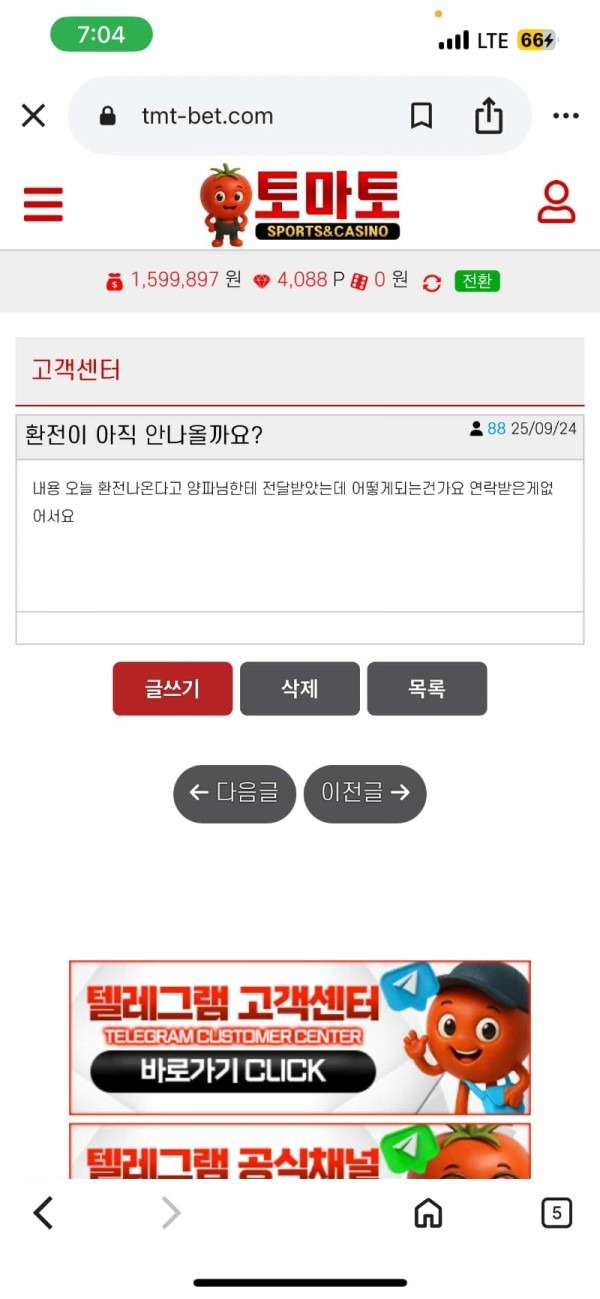 정말 아무이유없이 처음엔 장이공격받아서 내일환전이 가능하다했고 다음날이되니 고객센터에문의하니 확인작업이후환전이 가능하대서 뭐지싶어 기다렸고 확인작업이 끝나지 않자 문의하니 잠수타고 환전은 취소당합니다 제가그전날120잃고 159환전친거였구요 대체 무슨이유로 잠수를타는지도 대체 사이트가 이정도돈으로이러는게 뭔가싶습니다 유튜브도하시고 하기에 믿었는데 정말충격이크고요