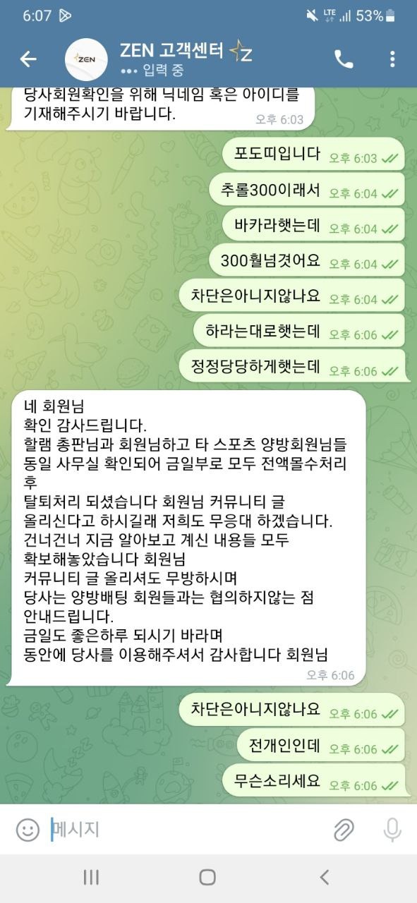 진짜 억울합니다 텔레판에 홍보하고 잇길래 첨으로 들어가서 느바세폴치고 당첨금의 추롤300프로 쳐라해서 저는 그냥실배터라 그냥 배팅다채우고 환전처리 누르니 바로 차단먹엇습니다이런 쓰레기 같은 사이트들 쓰지마세요 진짜로 부탁드립니다진짜 억울하네여