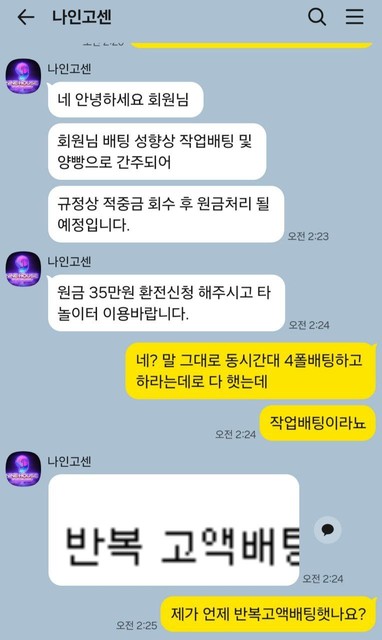 처음에 신규회원은 4폴더에다가2시간 차이 안나게 배팅하라고 해서 규정에맞게 배팅하였습니다.깜빡하고 3폴더 배팅하면 바로 배팅취소하고 연락 오구요그런데 당첨되니까 갑자기 원금가져가라고말하면서 정상회원은 4폴더 배팅 안 한다고 합니다수시로 배팅보고 취소하면서 4폴더 해야한다고 안내까지 해주는 사이트가 경기 끝날때까지 아무말도 없다가 끝나고 나니까 저러네요ㅎ 그리고 30 40만원 배팅하는게 반복적인 고액배팅이라고 하는데뭐 얼마를 충전해야되는건지...ㅎ10만원 충전해서 6폴더 이상까야실베터인가봐요다른분들 조심하세요주소 나인하우스.