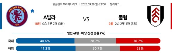 【EPL】 9월28일 애스턴 빌라 vs 풀럼 토토사이트, 스포츠분석