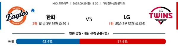 한화는 선발과 타격에서 모두 불안 요소가 크다. 특히 LG 타선이 이미 문동주를 무너뜨린 직후라는 점에서 정우주 역시 공략 대상이 될 가능성이 높다. 반면 LG는 임찬규가 후반부 체력 저하에도 불구하고 선발 싸움에서 확실히 우위를 점할 수 있고, 타선의 활약도 이어질 전망이다. 전체적인 전력과 흐름을 감안하면 LG가 승리를 가져갈 가능성이 높다.