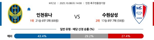 【K리그2】 10월08일 인천 유나이티드 FC vs 수원삼성블루윙즈 토토사이트, 스포츠분석