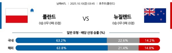 이 경기는 미드필드 지배력과 전환 속도에서 폴란드가 확실히 우위를 점할 가능성이 높다. 스지만스키의 좌우 스윙 패스와 포켓 공간 창출은 뉴질랜드의 수비 블록을 흔드는 핵심 무기가 될 것이다. 피옹테크와 스비데르스키의 침투 조합이 완성도 높은 득점 루트를 만들어낼 수 있으며, 중원의 압박과 세컨드볼 장악력에서도 폴란드가 우세하다. 반면 뉴질랜드는 우드 중심의 단조로운 공격 패턴과 느린 빌드업으로 인해 전개가 막힐 가능성이 높다. 전술 완성도와 개개인의 퀄리티 차이로 폴란드가 경기 주도권을 확실히 쥘 전망이다.
